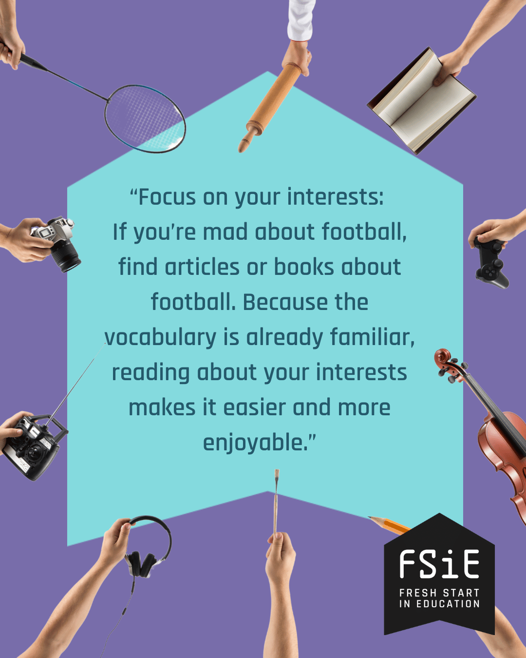 Focus on your interests: If you’re mad about football, find articles or books about football. Because the vocabulary is already familiar, reading about your interests makes it easier and more enjoyable.